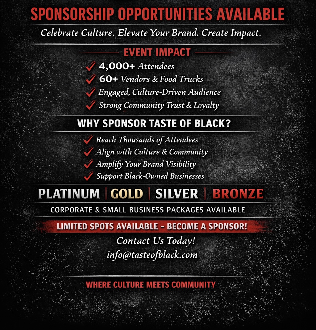 Taste of Black is a premier cultural experience and marketplace created to celebrate Black excellence through food, fashion, art, and entrepreneurship. With thousands of attendees, high-energy entertainment, and intentional community engagement, Taste of Black offers vendors a powerful opportunity to showcase their brand, increase sales, and expand their reach. This is more than vending , it’s visibility, connection, and growth!